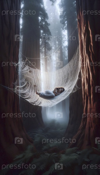 Женщина спит в гигантской паутине секвойи, Ai generated image