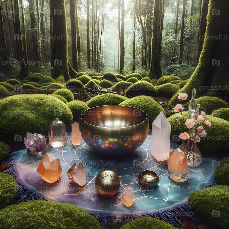 Кристальная решетка и певческая чаша на йога-матке в моховом лесу, Ai created image