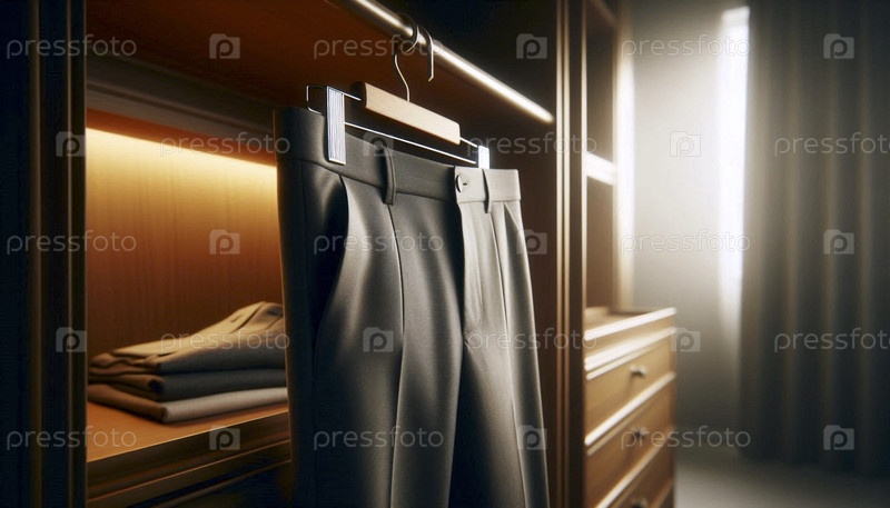 Макет серых шерстяных брюк, аккуратно напечатанный и положенный над деревянным столом для валета, Ай создал изображение