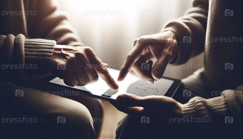 Ментор направляет младшего коллегу, их руки вместе указывают на сложную диаграмму данных на планшете, Ai generated image