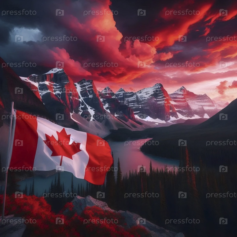 Канадский флаг в северном ландшафте дикой природы, Ai generated image