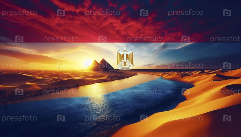Египетский флаг в древней пирамиде пустынный ландшафт, Ai generated image