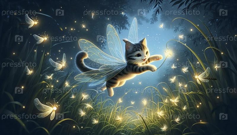 A playful fairy cat chasing fireflies наклейка, Ай создал изображение
