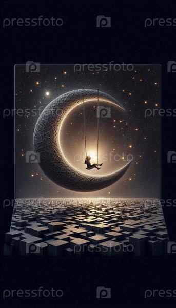 Ребенок, качающийся на полумесяце над городом, Ai generated image