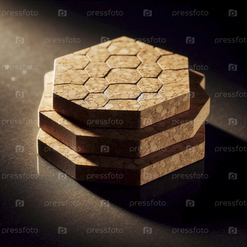 Набор трех шестиугольных макетов пробковых подъездов, наложенных друг на друга на гранитной поверхности, Ai generated image