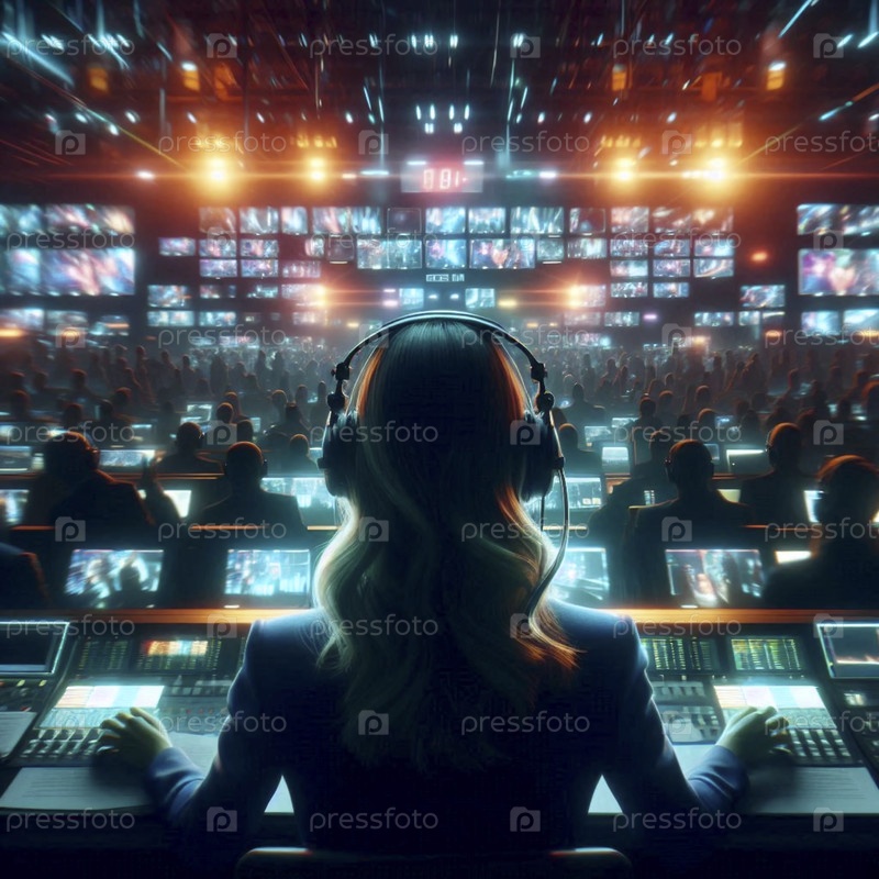 Более широкий кинематографический снимок окружающей среды, сделанный в хаотичной контрольной комнате, пропитанной неоном во время сетевой трансляции, Ai создал изображение