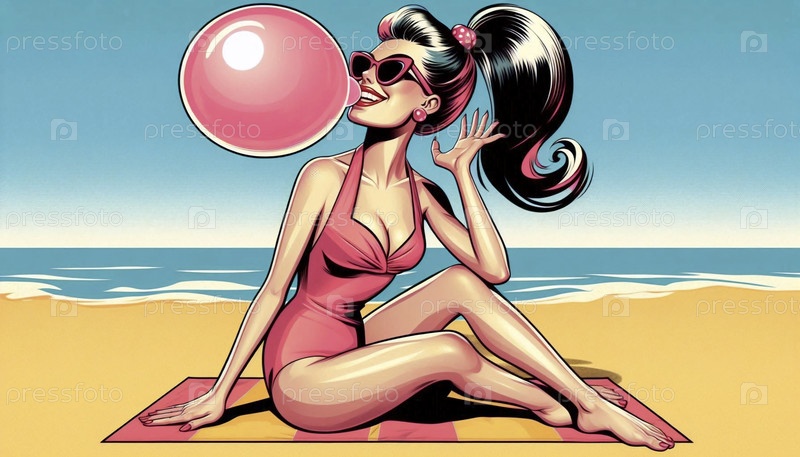 Пин-ап девушка в купальнике дует гигантский пузырь из жвачки, Ai generated image