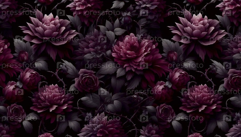 Темно-капризный цветочный бесшовный рисунок с сливовыми и бургундскими цветами на черном, Ai generated image