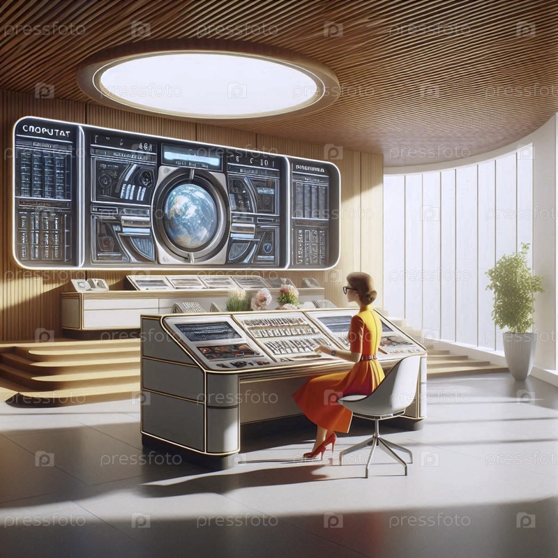 Просторный, минималистичный офис, где секретарша управляет большой футуристической компьютерной консолью с множеством кнопок и огней, Ai создал изображение