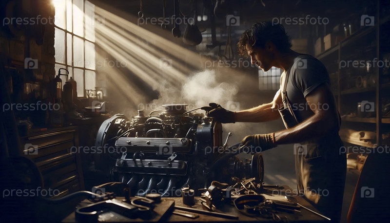Механик, работающий под поднятым капотом классического автомобиля в пыльном солнечном гараже с разбросанными инструментами и лучами света, прорезающими воздух, создал изображение Ай