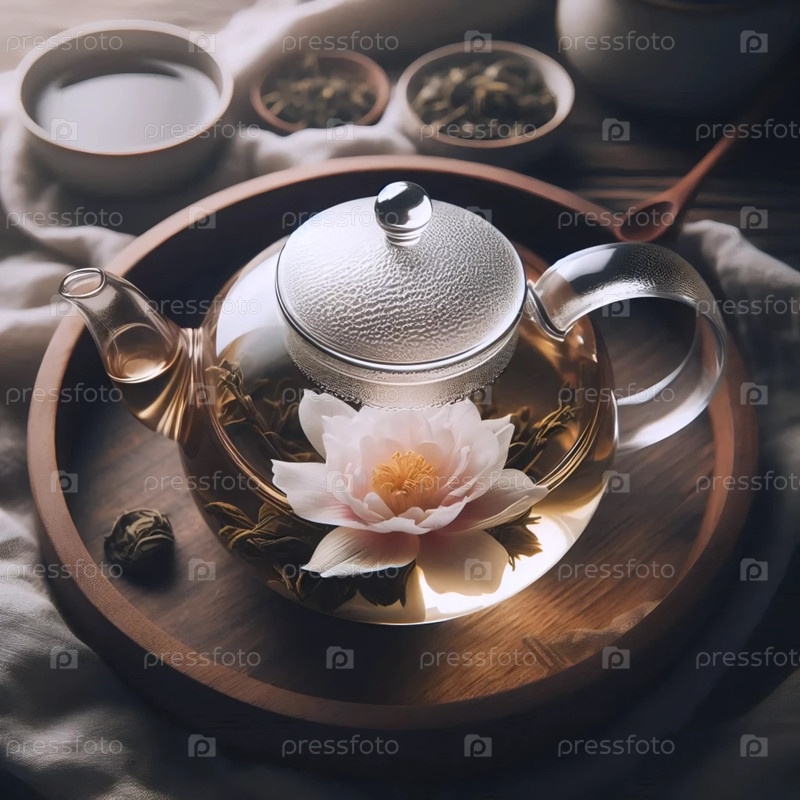 Чайник с цветущим чаем, Ai generated image Glass