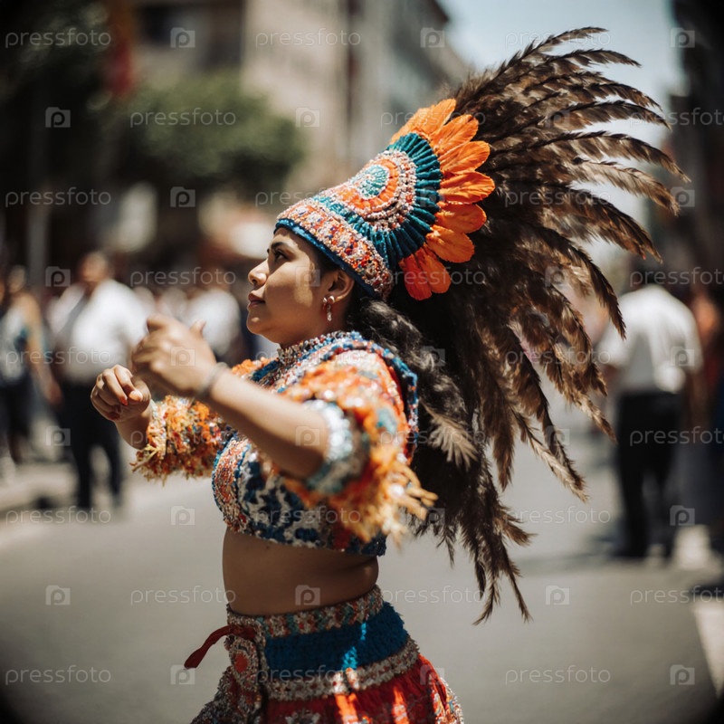 Живая танцовщица карнавала празднует свое наследие красочной одеждой и пернатым головным убором на оживленных улицах Мексики во время праздничных торжеств Generative AI