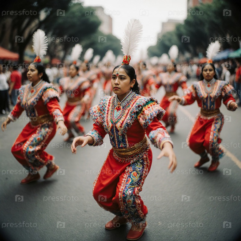 Мексиканские танцоры карнавала в ярких костюмах празднуют традиции на красочных улицах во время оживленного фестиваля