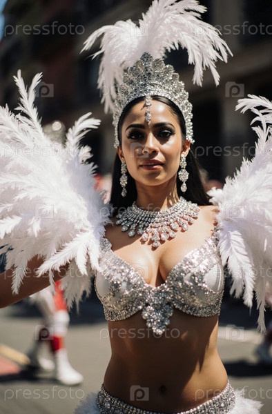 Вибрирующее празднование мексиканского карнавала с потрясающей женщиной в ослепительном костюме во время оживленного уличного парада в самом сердце города генеративный ИИ