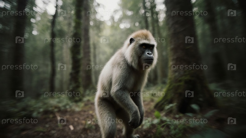 Загадочная обезьяна исследует туманный лес, смешиваясь с природой во время раннего утра