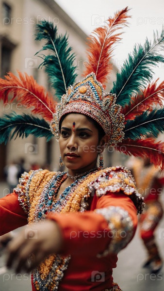 Вибрирующее празднование мексиканского латиноамериканского карнавала, в котором демонстрируется талантливая женщина, украшенная потрясающим пернатым костюмом во время ярких уличных торжеств на Sunset Generative AI