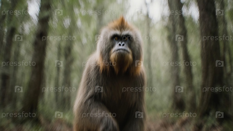 Любопытная обезьяна исследует пышный, зеленый лес в туманный день, демонстрируя свои отличительные черты и характер в естественной среде обитания генеративного ИИ