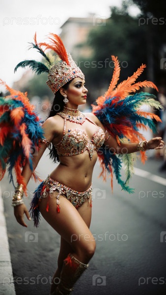 Живая танцовщица карнавала украшает улицы оживленной мексиканской вечеринки, демонстрируя изысканные перья и красочные наряды во время праздничного торжества