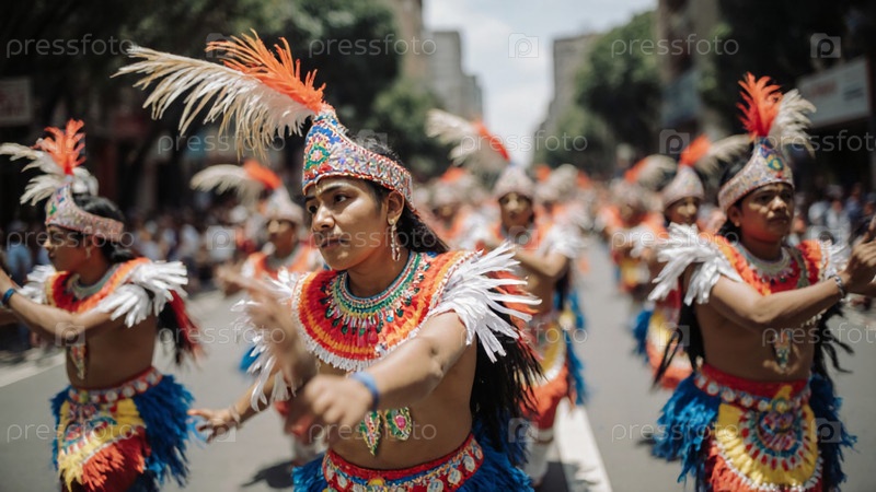 Мексиканские танцоры карнавала празднуют с яркими костюмами и оживленными ритмами на шумном уличном фестивале в самый разгар лета