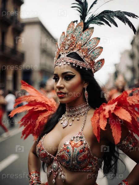 Живое празднование культуры с потрясающей женщиной мексиканского карнавала, демонстрирующей красочные перья и сложные костюмы на живой улице генеративного ИИ