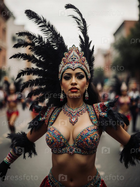 Вибрирующее празднование карнавала с мексиканской латиноамериканкой, украшенной ослепительным нарядом и пернатым головным убором среди радостных торжеств