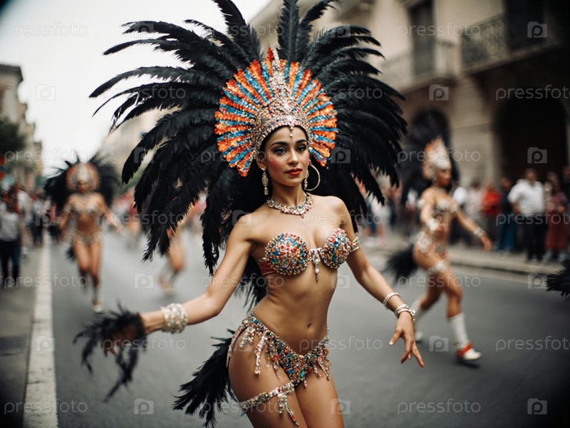 Женщина мексиканского карнавала ослепляет яркими перьями и искрящимися драгоценностями во время оживленного уличного праздника в самом сердце Латинской Америки Generative AI