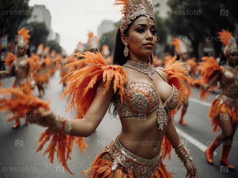 Живое празднование культуры с ослепительной танцовщицей карнавала, демонстрирующей традицию и элегантность в оживленном параде по улицам города генеративный ИИ