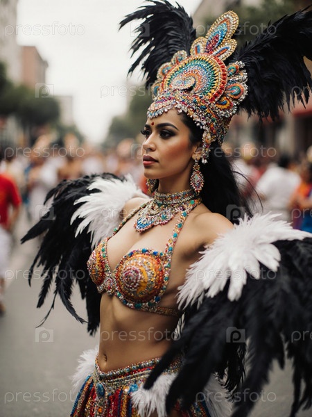 Живое карнавальное празднование с потрясающей мексиканской женщиной, одетой в сложный пернатый костюм на оживленных улицах во время праздничного парада