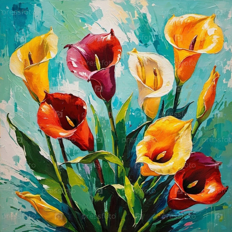 Ярко окрашенные лилии калла в оттенках красного, желтого, апельсинового и фиолетового цветов заполняют холст среди пышных зеленых листьев на ярком синем фоне, создавая привлекательный цветный дисплей