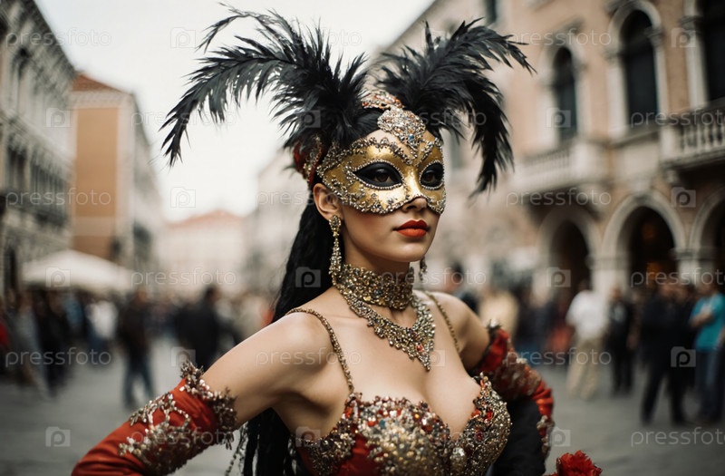 Потрясающая женщина, одетая в изысканное платье и ослепительную маску, уверенно стоит на Венецианском карнавале, окружена возбужденными весельщиками в исторической обстановке Generative AI