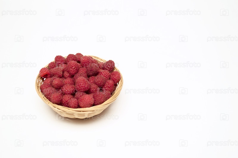 Спелая малина в плетеной корзинке на белом фоне