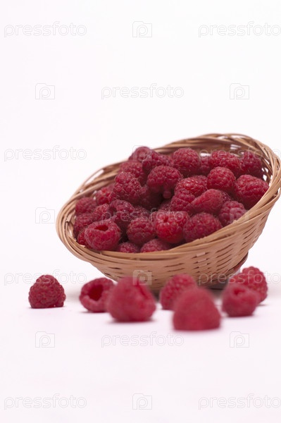 Спелая малина в плетеной корзинке на белом фоне