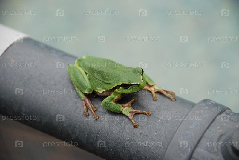 Зеленая лягушка сидит на краю бассейна