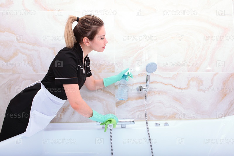Служанка в униформе убирает ванную комнату и душный кран Услуги по очистке дома Руки в защитных перчатках Понятие чистоты и порядка