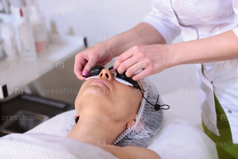 Подготовка к фотодинамической терапии. Пациенту надевают защитные очки. Молодая женщина проходит лечение лица с использованием светодиодов в салоне красоты. Концепция красоты и благополучия