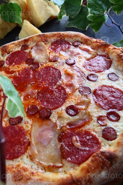 Пицца с мясными ингредиентами: грудь, охотничьи колбасы, бекон. два вида сосисок и бекона в мясной пицце. ближайший снимок