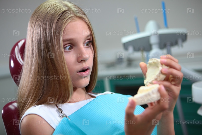 Девочка изучает отпечаток человеческих зубов. Ребенок удивлен. Красивая девушка с длинными светлыми волосами. Детская стоматология
