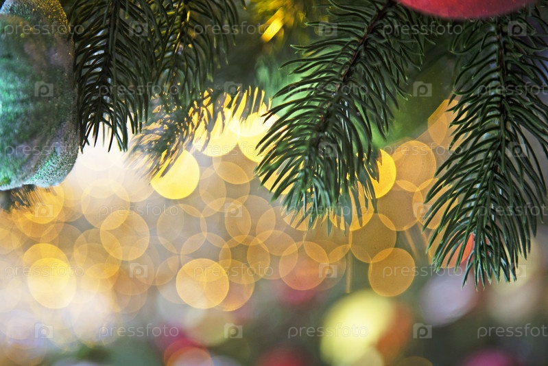 Гирлянда с огнями на рождественской елке не фокусируется. Рождественская текстура для открыток. Место для рекламы. Фон для поздравлений