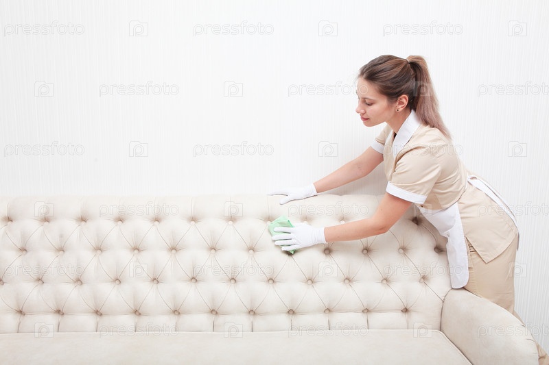 Девушка в униформе уборщицы стирает или чистит мягкую мебель. Непризнанная фотография. Только белые руки с перчатками. Концепция гостиничного бизнеса. Копирование пространства
