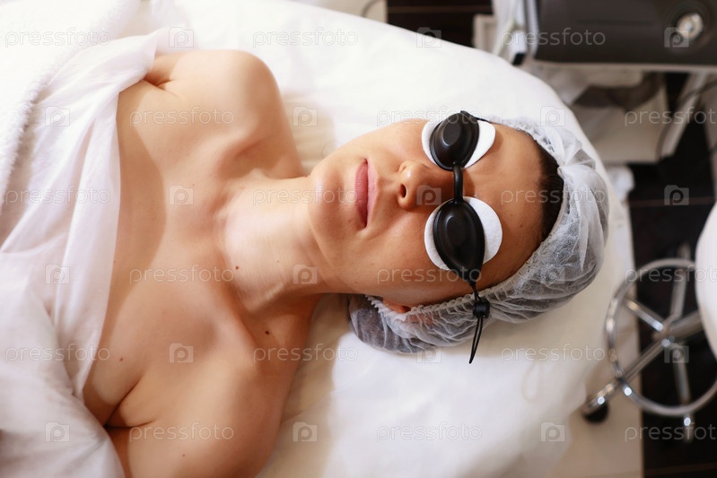 Пациент с защитными очками готовится к фотодинамической терапии лица Молодая женщина проходит лечение лица Концепция красоты и благополучия