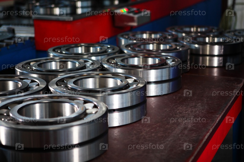 Производство подшипников. В производстве находится большое количество готовых подшипников. Готовые продукты на фабрике. Блестящая поверхность. Тяжелая промышленность. Мастерская на заводе тяжелой промышленности