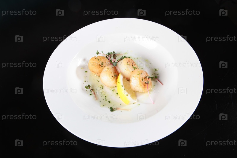 Раковины на белой тарелке с микрозелеными. блюдо из морепродуктов. кусок лимона и раковины. здоровая еда. низкокалорийная пища. копирование пространства. черный фон