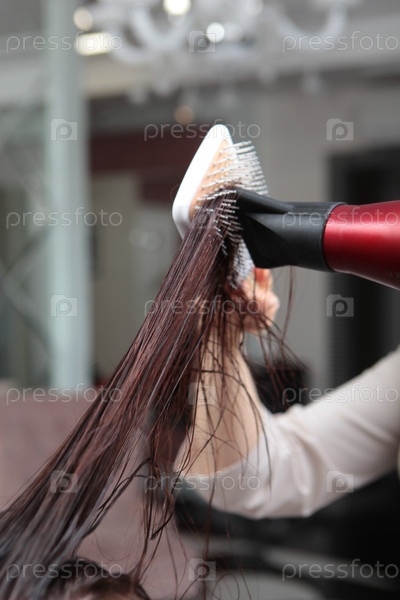 Женщина сушит волосы в салоне красоты с помощью фейерверка. Сушка длинных коричневых волос с помощью фейервера и плоской кисти. Концепция салонов красоты. Гребень и фейерверк ближайший снимок