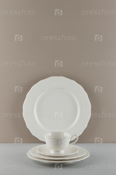 Белые пустые тарелки и чашки на бежевом фоне. Куча белых фарфоровых тарелок на бежевом фоне. Лайм-аут для размещения рекламной информации и маркетинговых объявлений. Карта продукта. Копировальное пространство