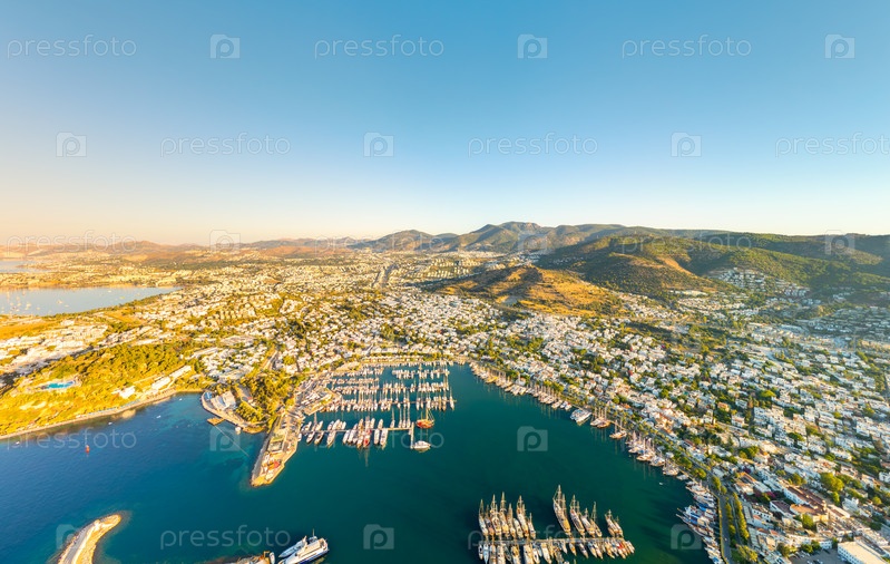 Широкая утренняя панорама яхт-марины, белых домов, городского пейзажа и горного фона в чистом утреннем освещении