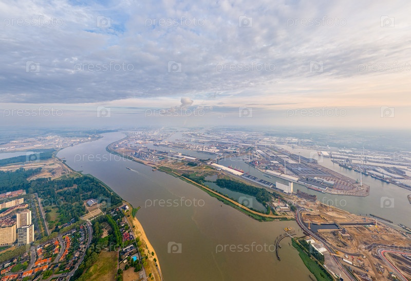 Антверпен, Бельгия. Панорама города. Река Шелда (Эскаут). Летнее утро. Вид с воздуха