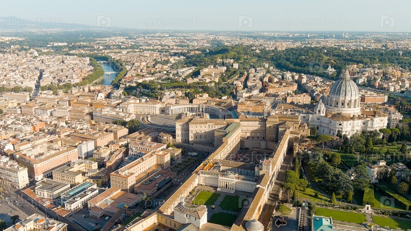 Рим, Италия. Вид на Ватикан. Базилика Сан-Пьетро, Пьяцца Сан-Пьетро. Полет над городом. Вечернее время, Aerial View