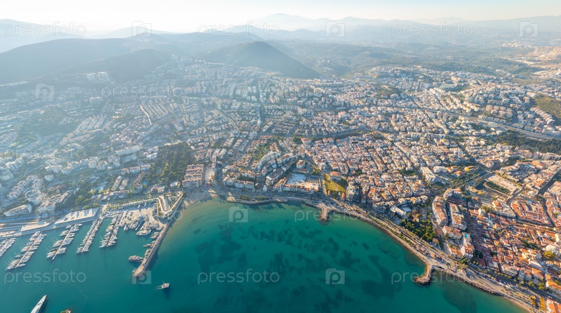 Кусадаси, Турция.Панорама с воздуха яхты-марина, пляж и набережная прогулка.Комплексная прибрежная зона отдыха с туристическими объектами.Вид с неба
