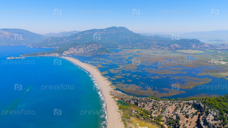 Потрясающий панорамный вид с беспилотного летательного аппарата на пляж черепахи Изтузу - золотая песчаная плюнь между извилистой рекой Далян и голубым Средиземным морем с горами