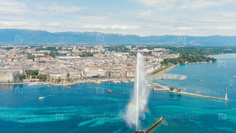Женева, Швейцария. Фонтан Дже-Дэу. Большой реактивный фонтан длиной до 140 метров. Главная достопримечательность Женевского озера. Летний день, Aerial View